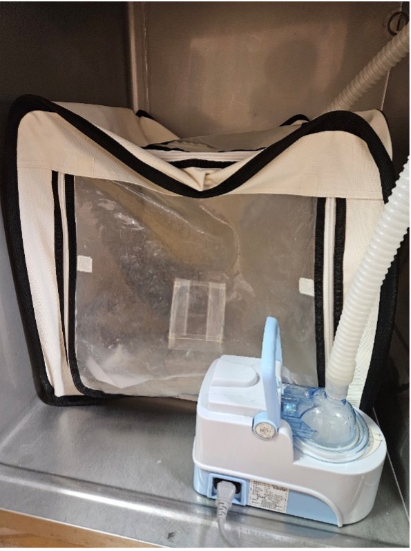 右の画像のような専用のケージに動物を入れ、ケージ内を霧状にした薬液で満たして、10分から15分程の噴霧を行います。