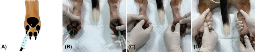 リンパ管は通常の血管造影だと造影されないため、このように肉球に造影剤を入れてマッサージをすることでリンパ管造影を行います。