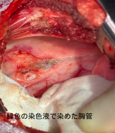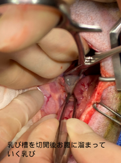 1,胸管結紮:胸管を糸でしばることによって乳びが胸に運ばれないようにします。