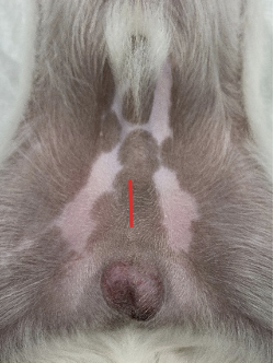 犬は陰茎と陰嚢の間、猫は陰嚢を切開します ☆赤線部分
