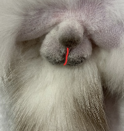 精巣が正常に陰嚢内へ下降せず腹腔内や鼠径部に留まった状態をさします。通常犬では生後約30日、猫では出産時には既に完了していますが、生後6か月までに陰嚢内に精巣が下降してない場合は潜在精巣の可能性が高いです。遺伝的要因が大きく、予防方法はありません。潜在精巣の場合、通常の陰嚢内にある子よりも精巣腫瘍のリスクがとても高まります。早めの去勢手術が推奨されます。また、腹腔内に留まると体温が高いため精子の成熟が妨げられ、不妊になりやすいという特徴もあります。