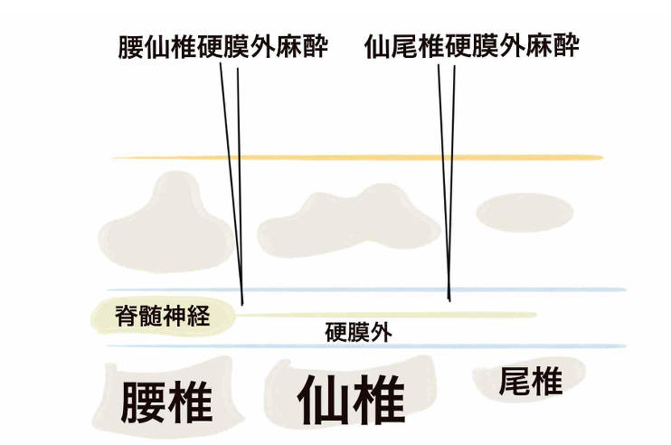 犬では第7腰椎と仙椎の間から針を刺入します。猫では神経の損傷の可能性があるため、仙椎と第1尾椎の間から刺入し局所麻酔剤を注入します。お腹やお尻、後肢の手術に対し使用され、術中だけではなく術後もゆっくり目を醒ましてくれます。